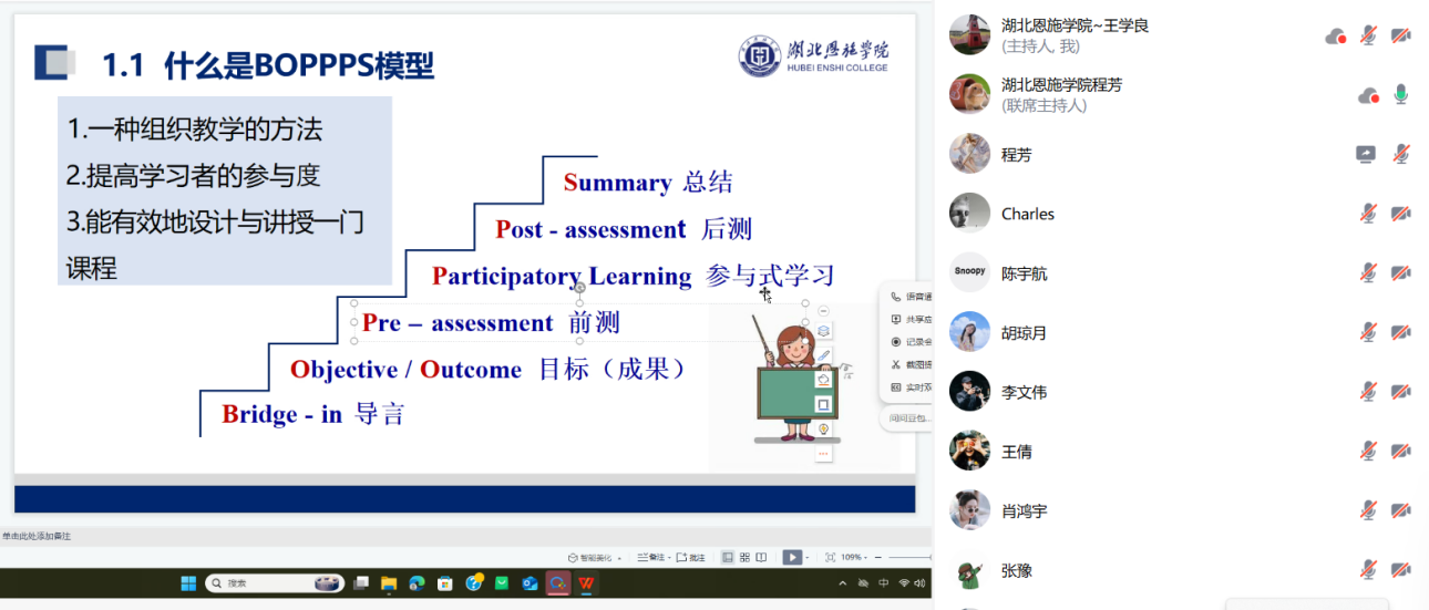 (通讯员 王学良 程芳)10月28日下午,《创新与创业》课程组通过线上会议召开了BOPPPS教学法培训与教改研讨会,全面落实学校“SC”教学改革和第三批多元化教学方法改革项目要求。课程组全体教师参会,通识学院职业发展教研室主任程芳应邀做专题培训。
