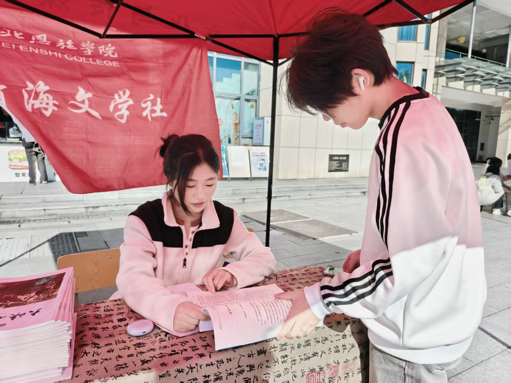 活动现场,瀚海文学社的宣传棚干净整洁,第九期大峡谷文学期刊整齐陈列,优秀文章奖品有序摆放,刚一布置好就吸引许多过往同学驻足询问。每日活动期间,工作人员会为第九期大峡谷征文获奖同学发放奖品及期刊,也会向同学们分享在审稿期间发现一些作品的亮点与小细节,真诚肯定同学们创作的用心。同时围绕第十期征稿活动展开全面宣传,清晰告知征稿主题、体裁要求、截稿时间及投稿方式,耐心解答同学们关于稿件选题方向、创作技巧等疑问,同时通过现场互动交流,倾听同学们对社刊内容、活动形式的建议,轻松互动中拉近了与同学们的距离。