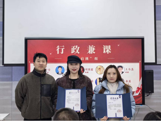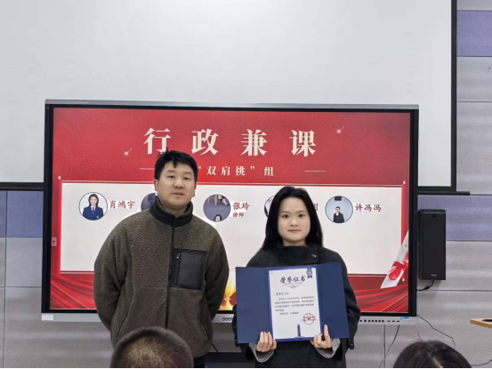 在颁奖环节,获奖教师依次上台领奖,现场掌声不断,气氛热烈。随后的教师分享环节中,李颜老师作为职业发展教研室代表,分享了《大学生职业生涯规划》课程的教学心得;唐兴源老师则代表智能工程学院学生发展中心,围绕《创新与创业》课程畅谈教学体会与获奖感言,展现了青年教师在教学一线的积极探索与育人情怀。