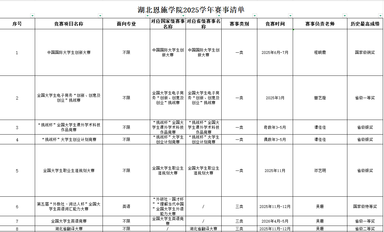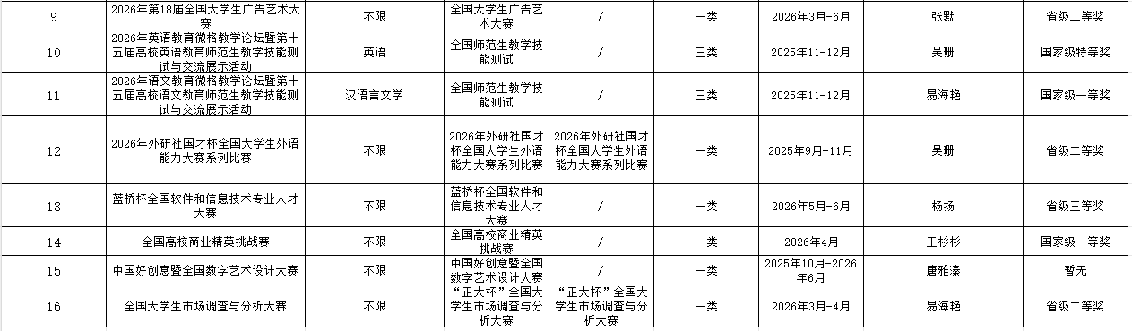 为进一步激发学子在2025-2026学年学科探索热情,促进学术创新与实践能力提升。现正式公布2025-2026学年文化与传媒学院学科竞赛赛事清单。本清单涵盖竞赛项目名称、面向专业、赛事类别、竞赛时间、赛绩及赛事负责老师等。