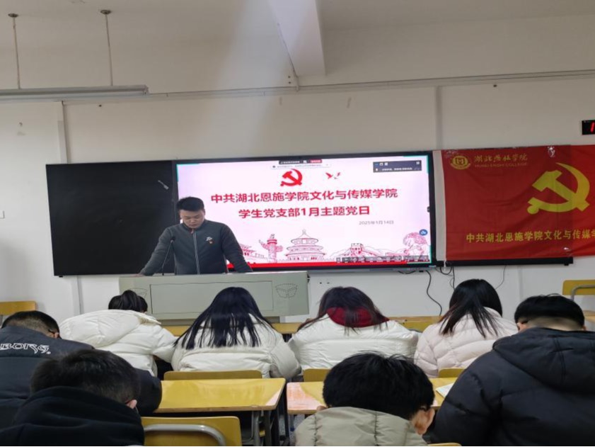 (本网讯 祝广恩)为强化党员政治素养与使命担当,推动支部建设提质增效,2026年1月14日,文化与传媒学院学生党支部在至精楼208教室通过线上线下相结合的方式开展了“回望来时路、奋进新征程”的主题党日活动,活动由吴柳同志主持。活动伊始,进行了党费收缴工作。吴柳同志带领全体党员重温入党誓词,并由祝广恩同志领诵党章部分章节。理论学习环节,贺紫薇等同志分别领学了中共中央政治局会议精神、中央经济工作会议精神及中共中...